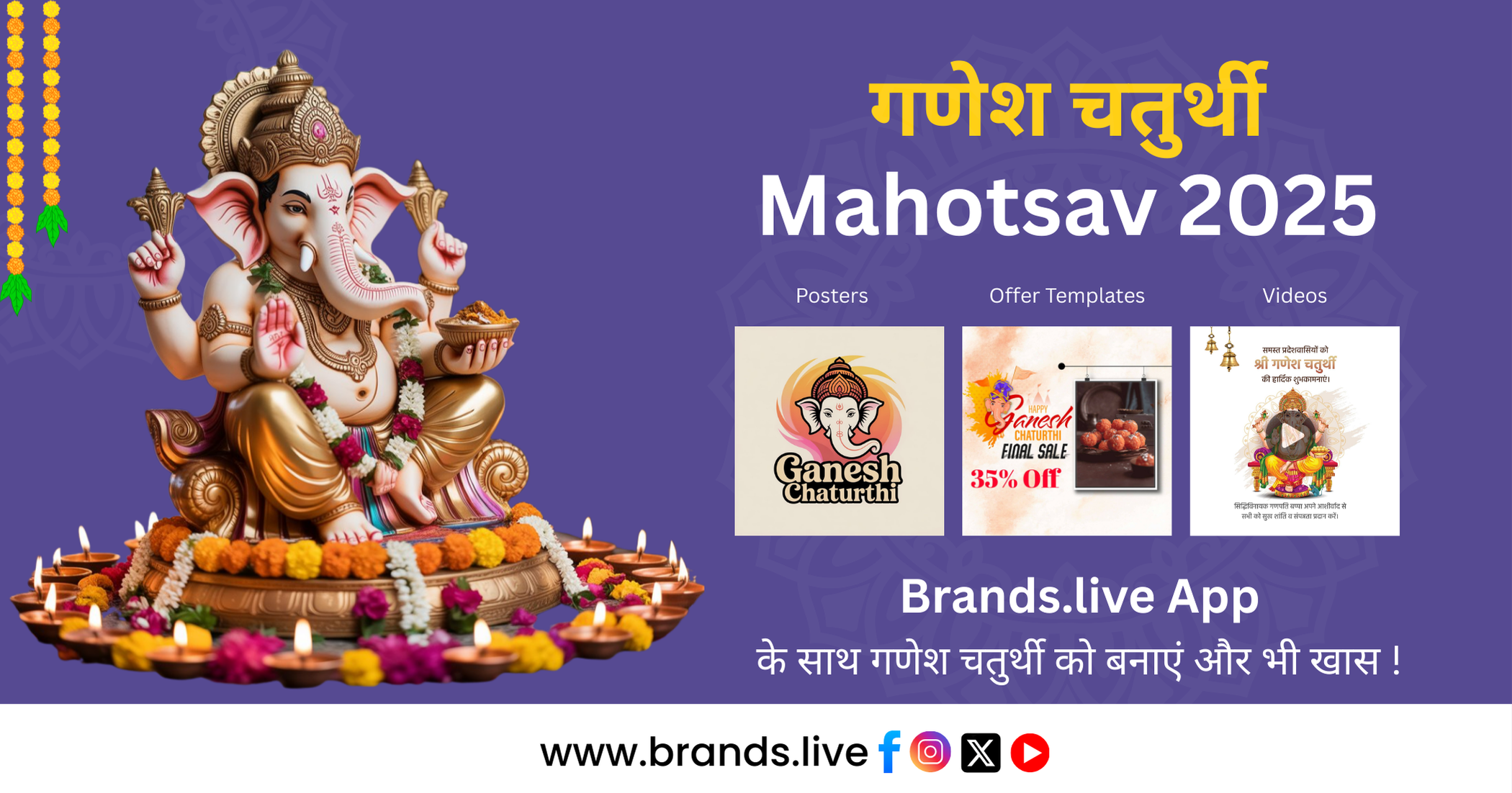 Brands.live एक ऐसा प्लेटफॉर्म है जहां से आप शानदार Ganesh Chaturthi 2025 Poster डाउनलोड कर अपने प्रियजनों के साथ शेयर कर सकते हैं। इसके अलावा इस ऐप से आप ganesh chaturthi banner भी बना सकते हैं।