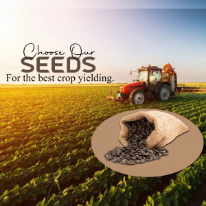 Description: An advertisement showcasing crop seeds being purchased online. The image features a sack of seeds spilling onto a smartphone, with text promoting online shopping.