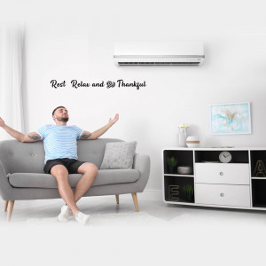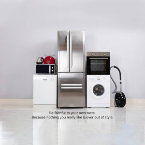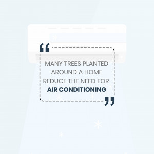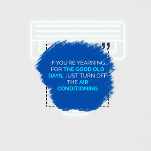 Description: A digital illustration showcasing a white air conditioner unit against a light blue and white background, with a banner promoting appliance deals.