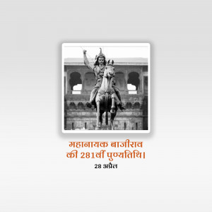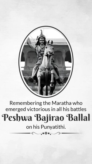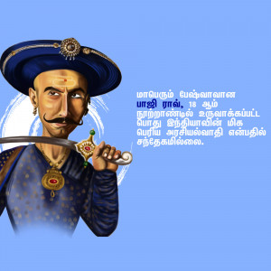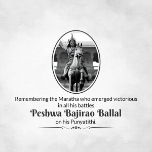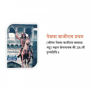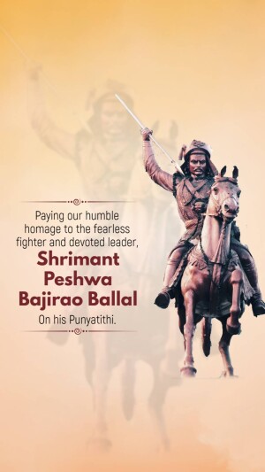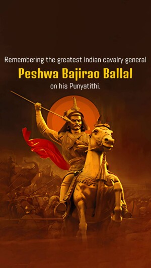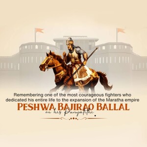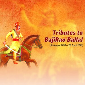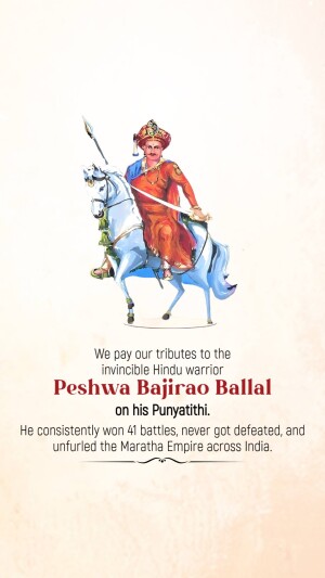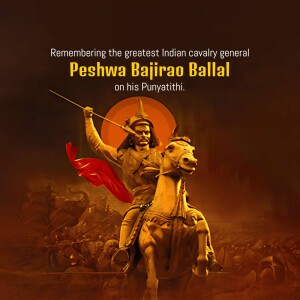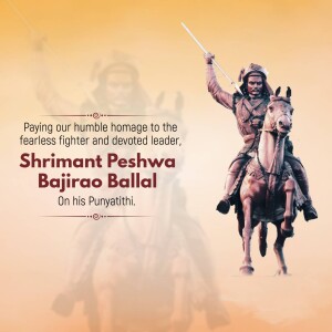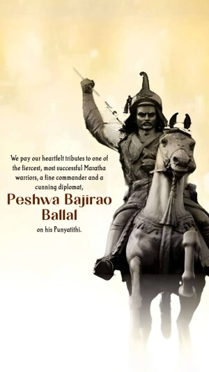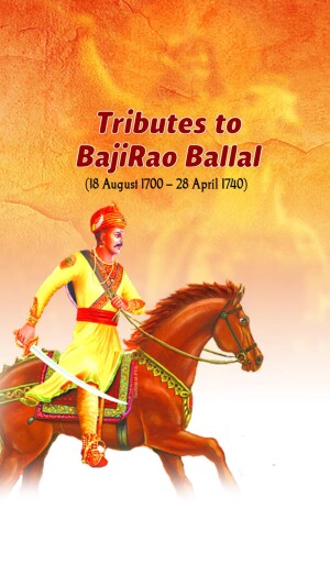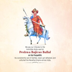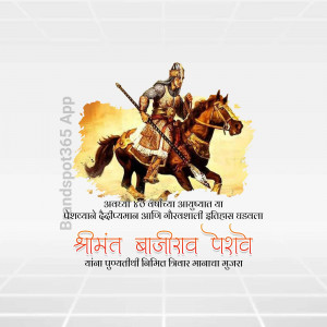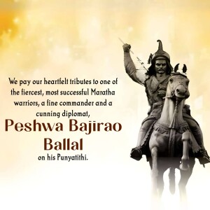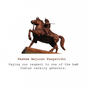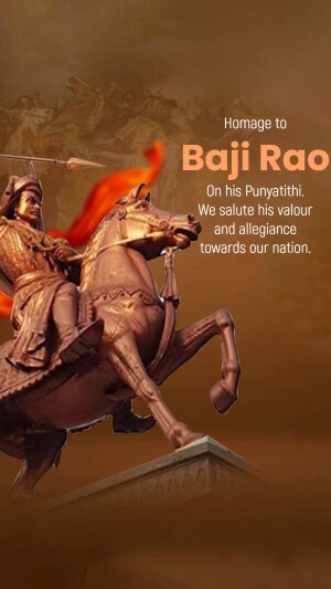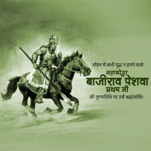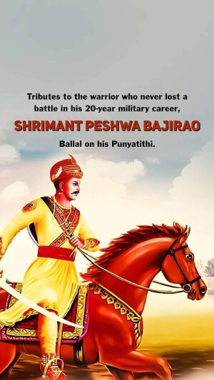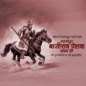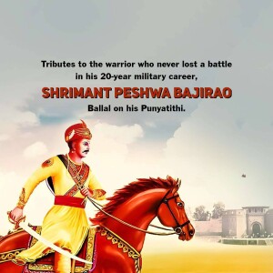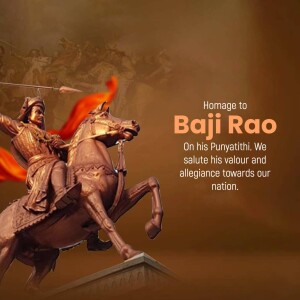 Description: A commemorative image depicting Bajirao Peshwa on a horse, with a text tribute in Hindi honoring his bravery and legacy.