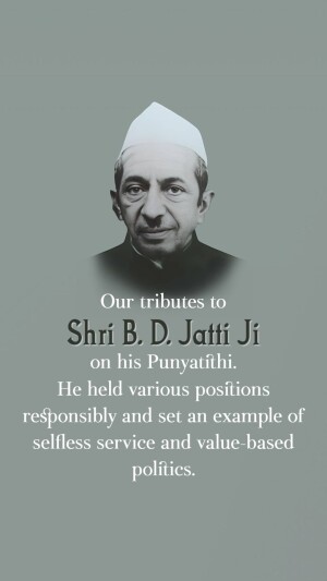 Keywords: B.D Jatti Punyatithi, Hindi, person, B.D. Jatti, Vice President of India, Indian politics, Commemoration, hindi text, Portrait, Tribute