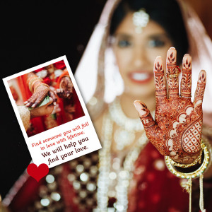 Description: An image featuring a newlywed Indian couple walking on a beach, with a blue graphic overlay promoting marriage and soulmate connections.