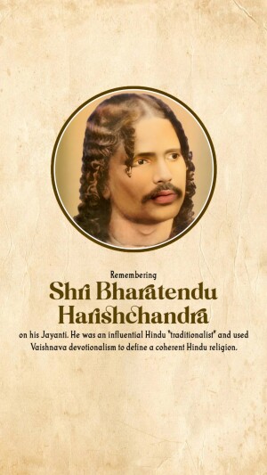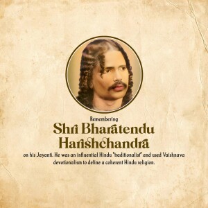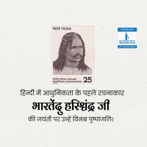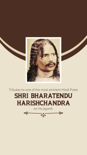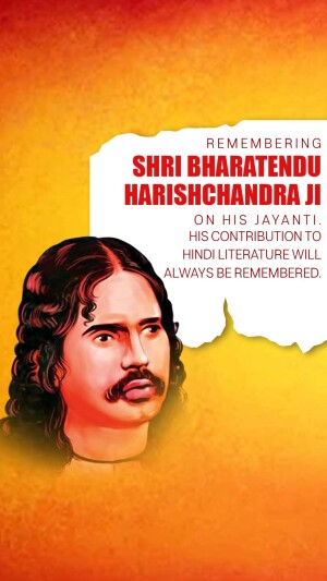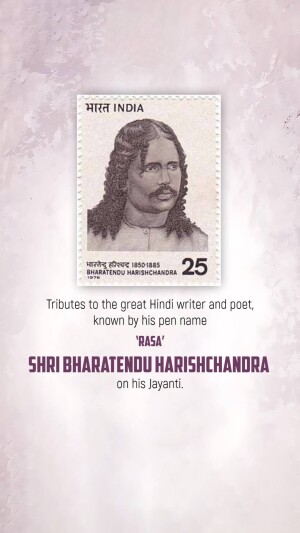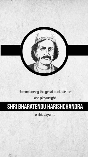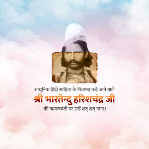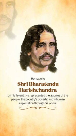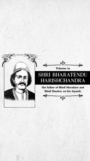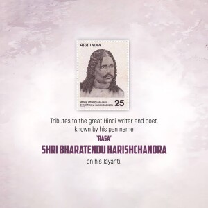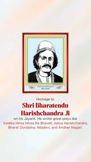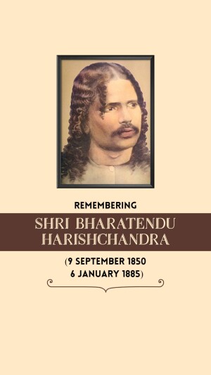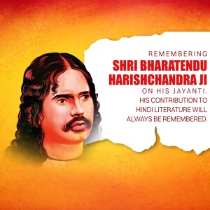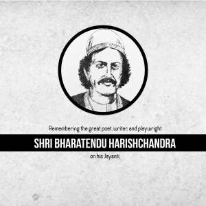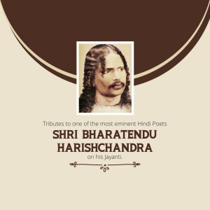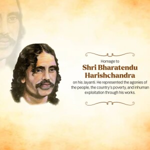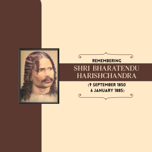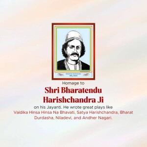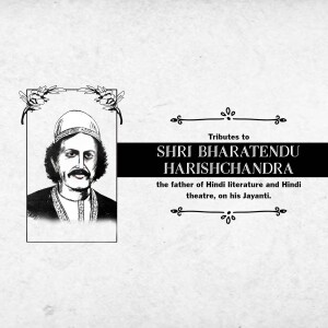 Description: A stylized illustration of Bharatendu Harishchandra, a prominent figure in Hindi literature and theatre, with a tribute message below.
