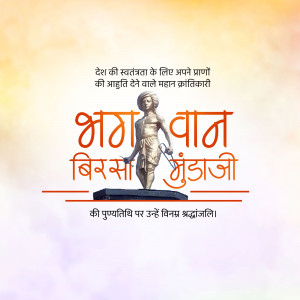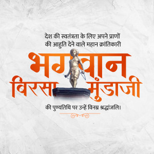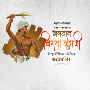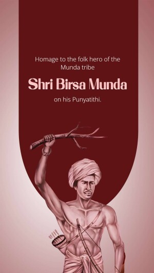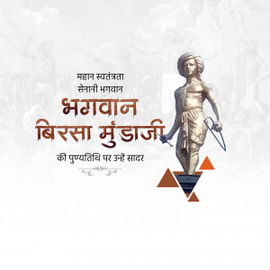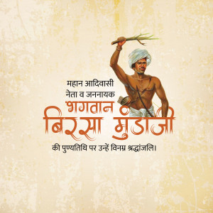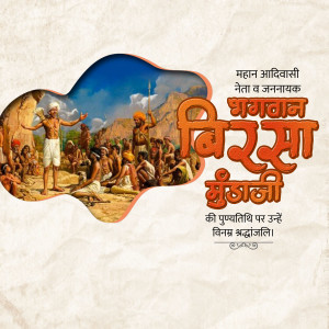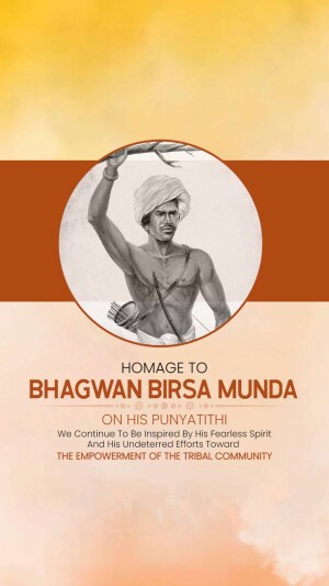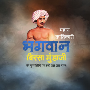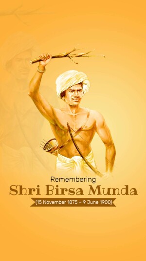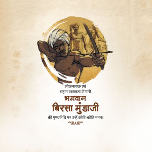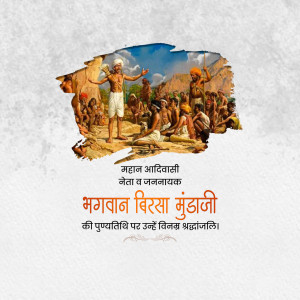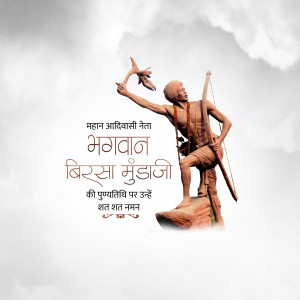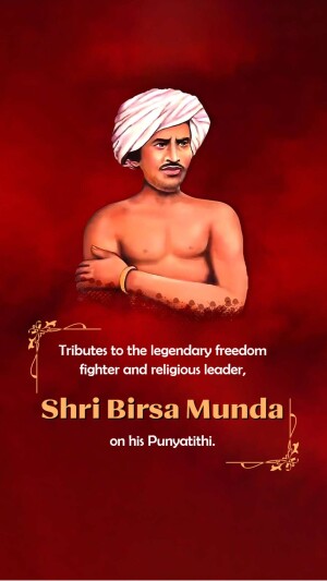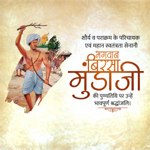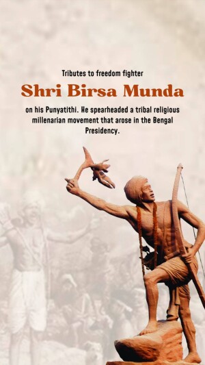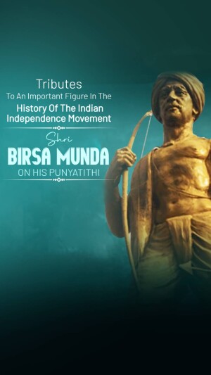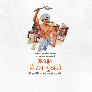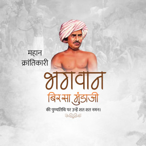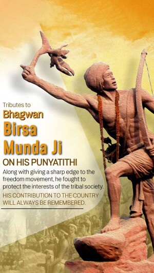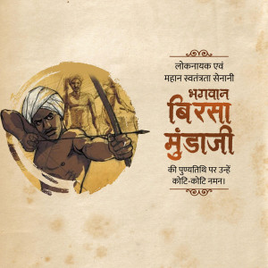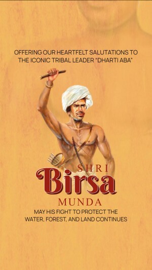 Description: An artistic depiction of Birsa Munda, a prominent figure in the Indian independence movement, known for his fight against British rule and advocacy for tribal rights. The image includes text in Gujarati honoring him.