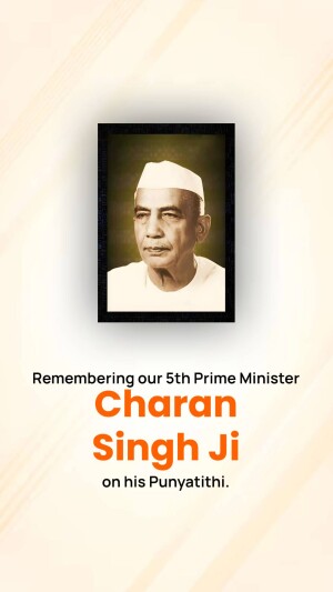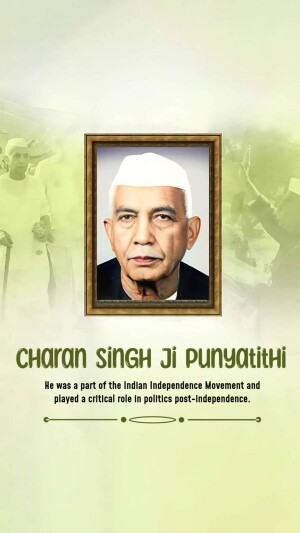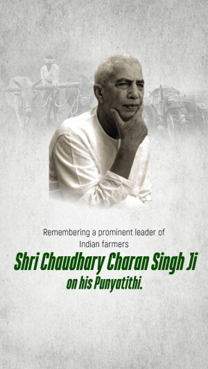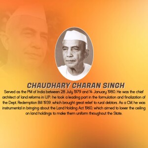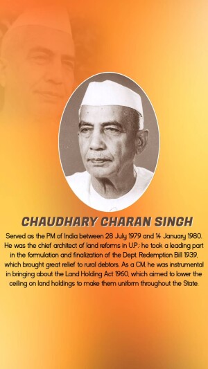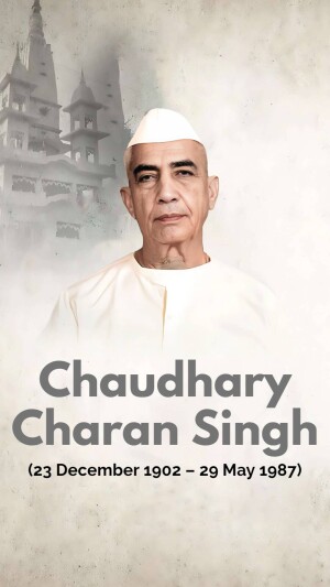 Description: A commemorative image featuring a portrait of Chaudhary Charan Singh, a former Prime Minister of India, with text in Hindi detailing his birth and death dates and a tribute.