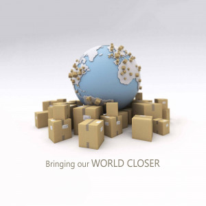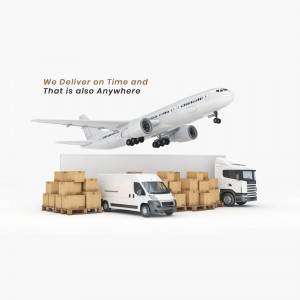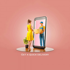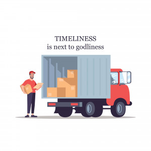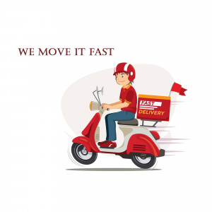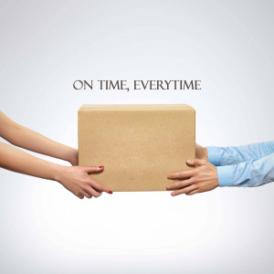 Description: An illustration of a delivery worker pushing a hand truck loaded with cardboard boxes. The image conveys reliability and customer satisfaction.