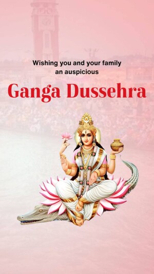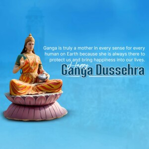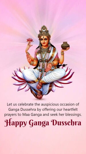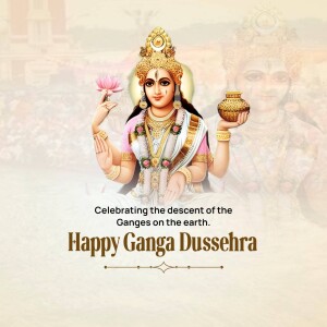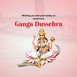 Description: A devotional image celebrating Ganga Dussehra, featuring Goddess Ganga seated on a lotus flower. The image includes text in Gujarati wishing a happy Ganga Dussehra and offering prayers.