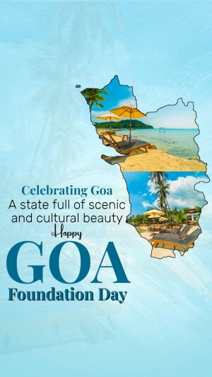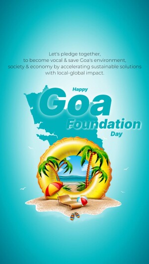 Description: A vibrant image celebrating Goa Foundation Day, featuring a beautiful beach scene with palm trees, blue waters, and colorful beach chairs. The text 'GOA Foundation Day' is prominently displayed.