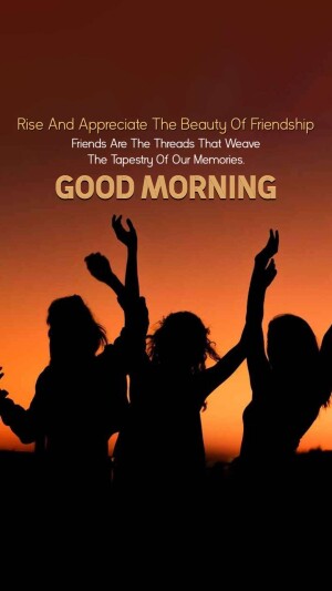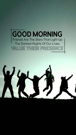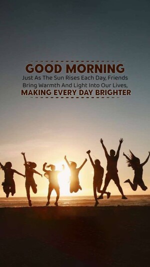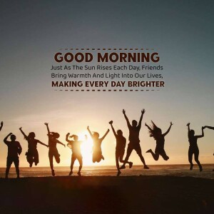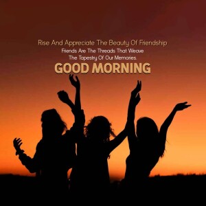 Description: An inspirational image featuring silhouettes of people enjoying a sunrise, with a motivational quote about the value of friendship and a 'Good Morning' greeting.