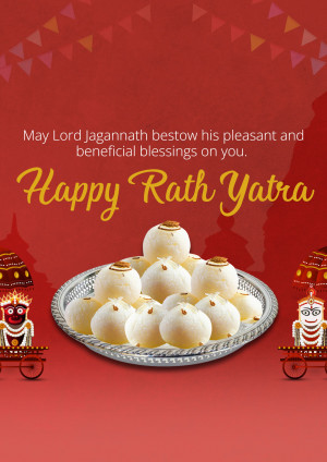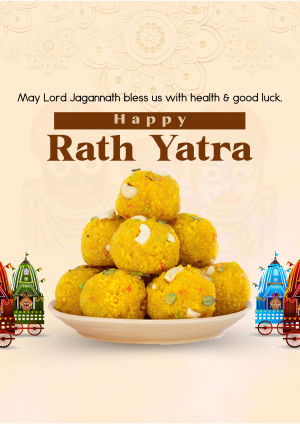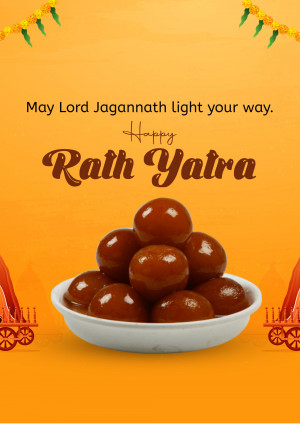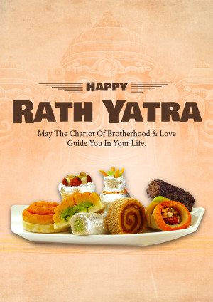 Description: A festive image wishing 'Happy Rath Yatra' with a depiction of traditional Indian sweets and temple architecture.