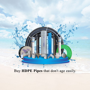 Description: An advertisement showcasing a variety of black HDPE pipes and fittings against a blue gradient background. Telugu text is prominently displayed at the top.
