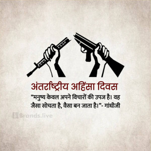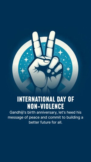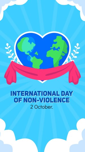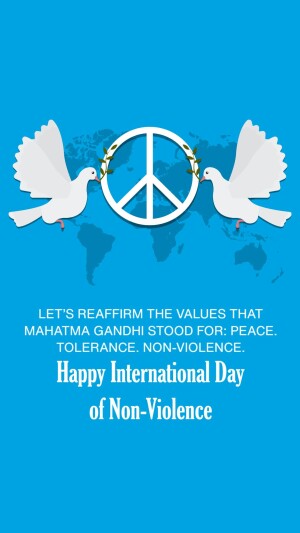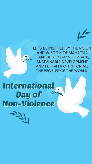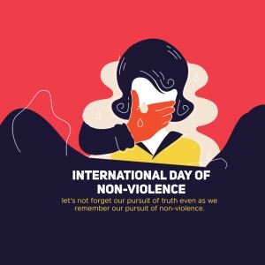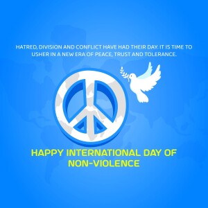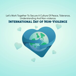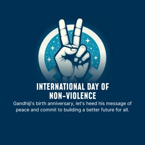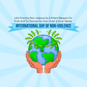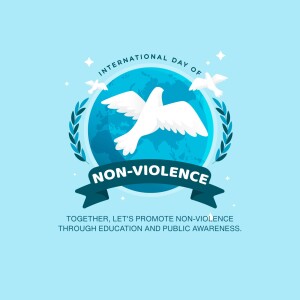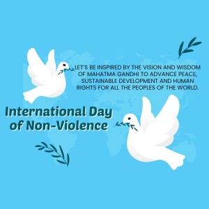 Description: A graphic design celebrating the International Day of Non-Violence with doves, a globe, and the quote 'Ahimsa Paramo Dharma'.