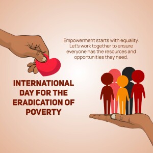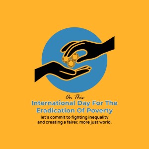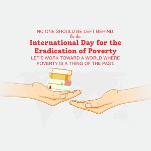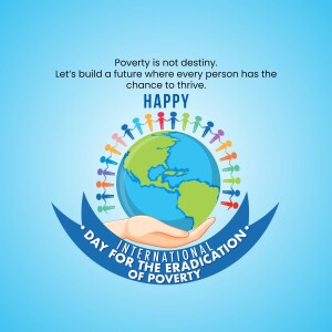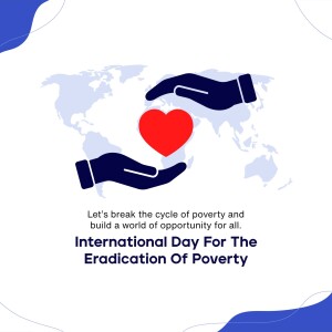 Description: A vibrant illustration for International Day for the Eradication of Poverty. It shows hands holding a globe with figures representing people needing help. Text in Hindi is included, promoting solidarity and commitment to reducing poverty.