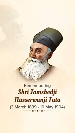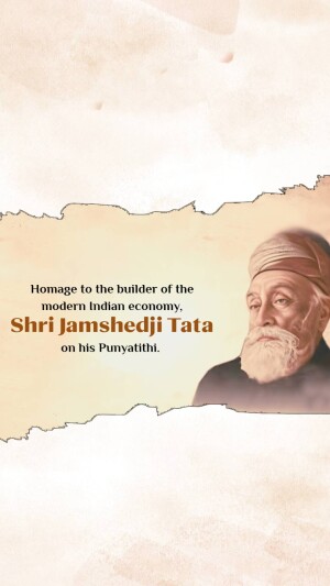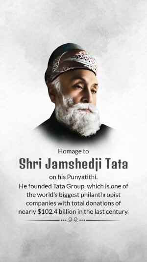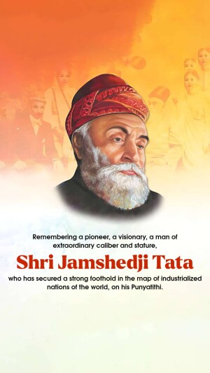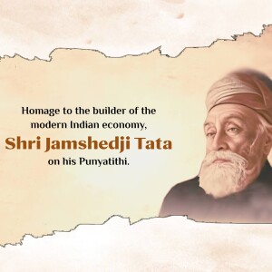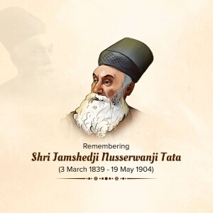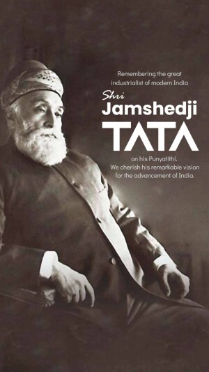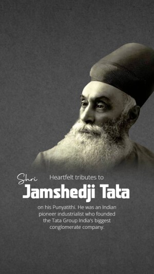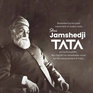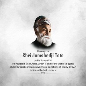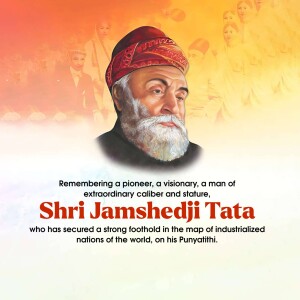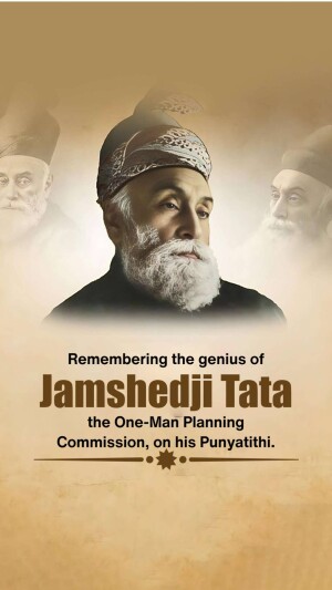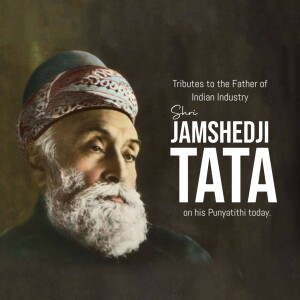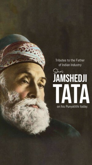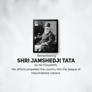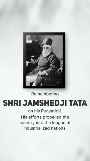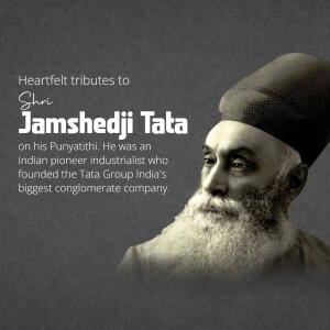 Description: A commemorative image honoring Jamshedji Tata on his Punyathithi (death anniversary). The image features a portrait of Jamshedji Tata with text acknowledging his contributions as an Indian industrial pioneer and founder of the Tata Group.