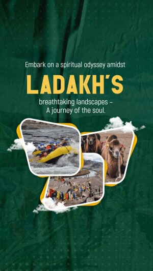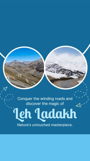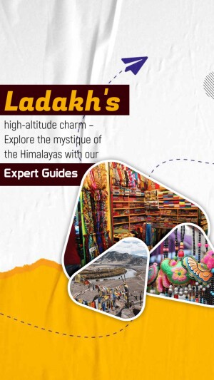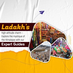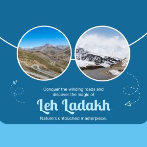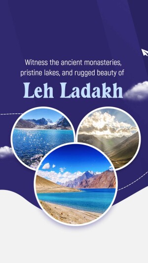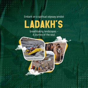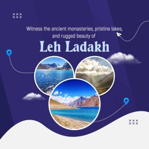 Description: An advertisement for a Leh Ladakh tourism package, showcasing the beauty of the Himalayas and the serene landscapes of Leh Ladakh. Includes images of snow-capped mountains, monasteries, and winding roads.