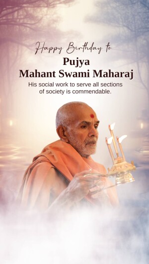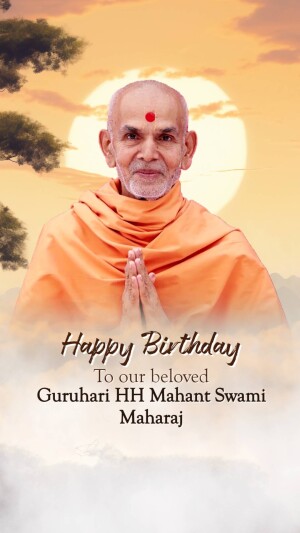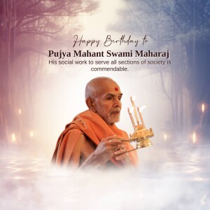 Description: An image featuring Mahant Swami Maharaj, a spiritual leader, with a birthday wish written in Gujarati script. The background is a soft, blurred image of other spiritual figures.