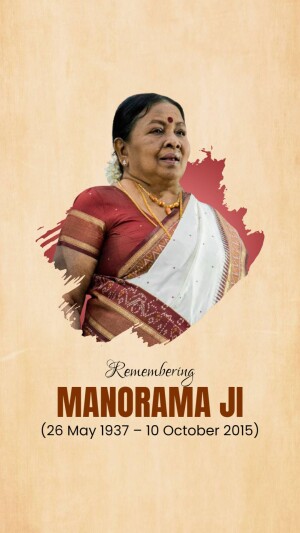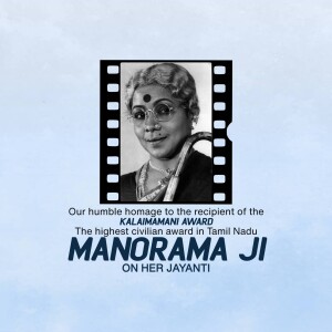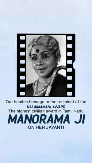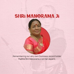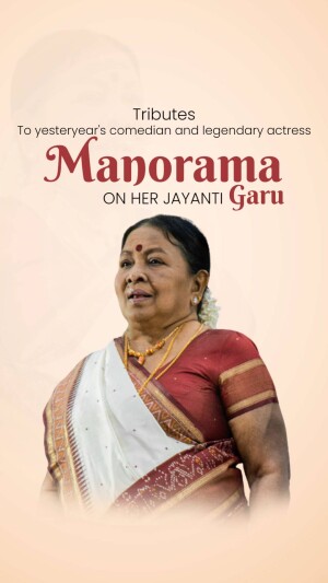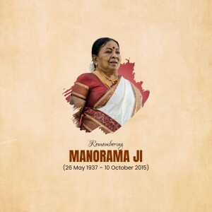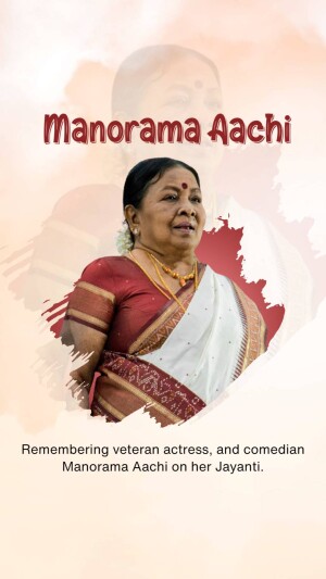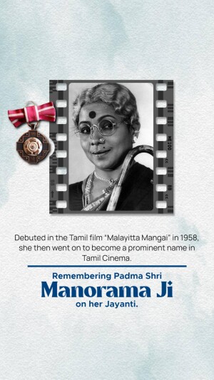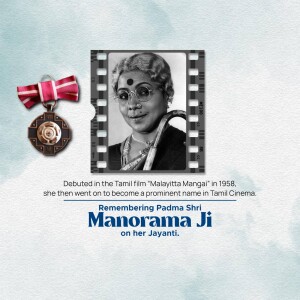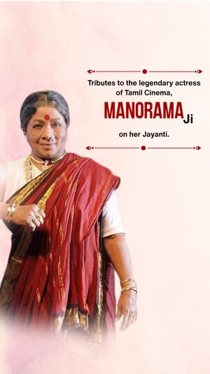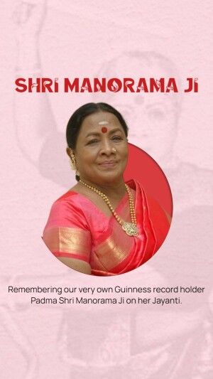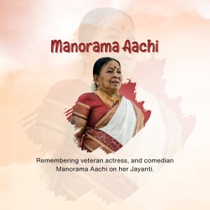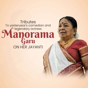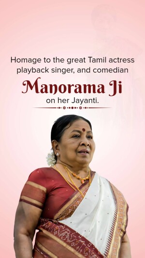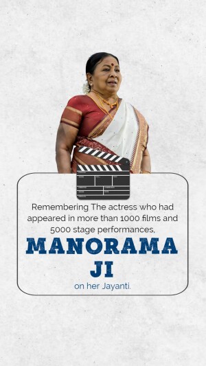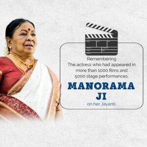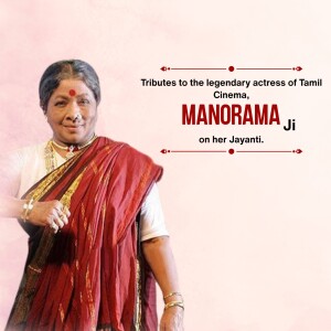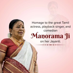 Description: A commemorative image featuring Manorama Ji, a renowned Indian actress, with text in Hindi celebrating her birthday and achievements.