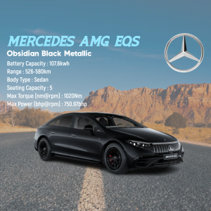 Description: An advertisement showcasing the Mercedes-Benz AMG GT 63 S in Obsidian Black, highlighting its engine size, fuel type, and mileage.