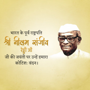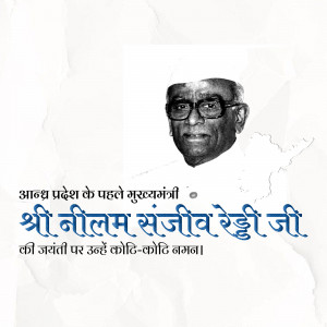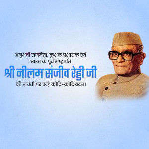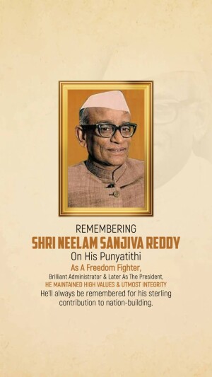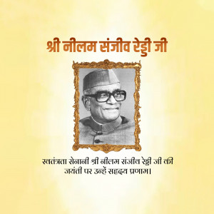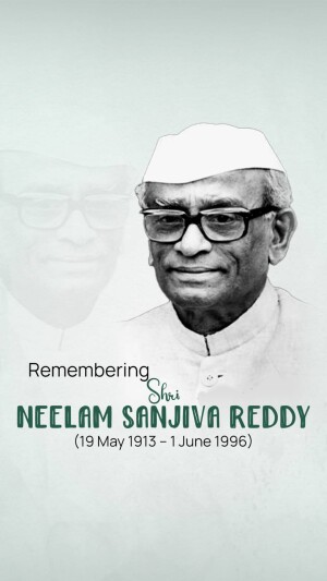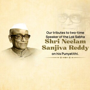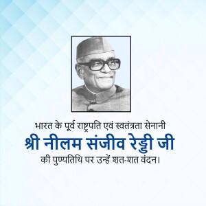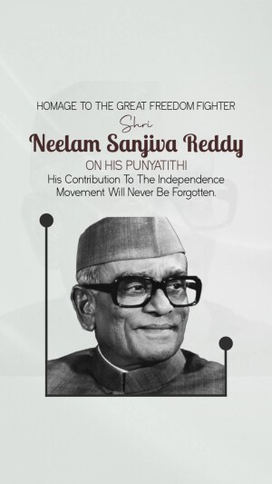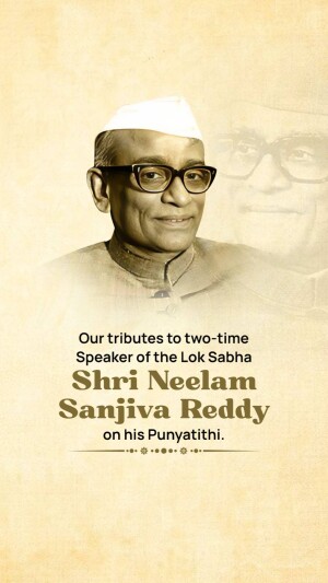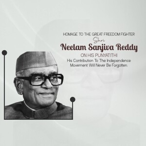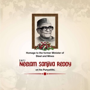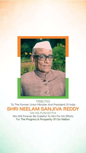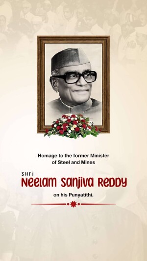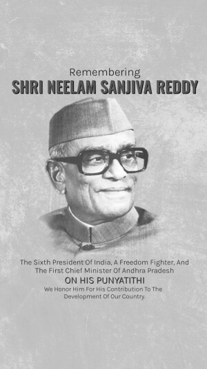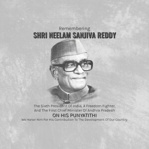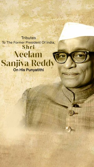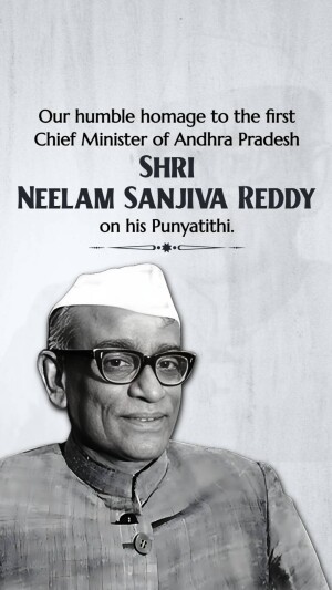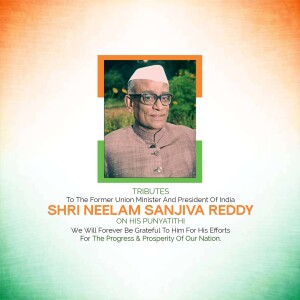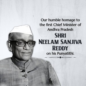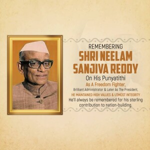 Description: A commemorative image paying homage to Shri Neelam Sanjiva Reddy on his Punyathithi (death anniversary). The image features a portrait of Shri Reddy in a suit and glasses against a yellow and patterned background.