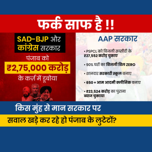 Description: A political poster in Hindi making accusations against previous SAD-BJP and Congress governments in Punjab, and contrasting them with the current AAP government. It highlights alleged financial irregularities and claims of improvements under the AAP administration.