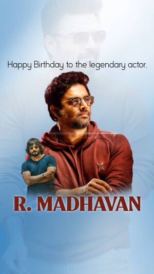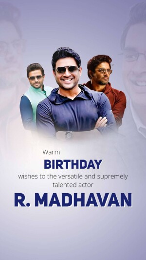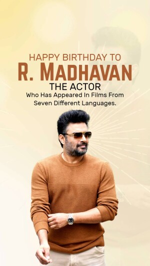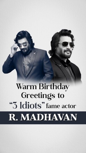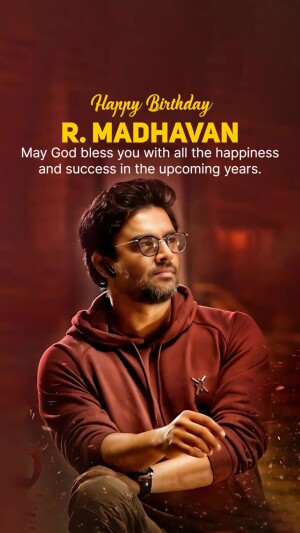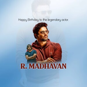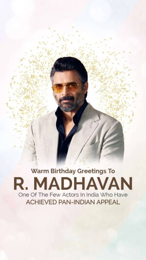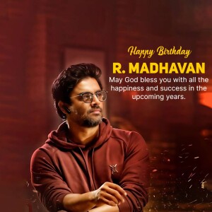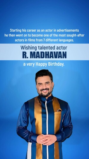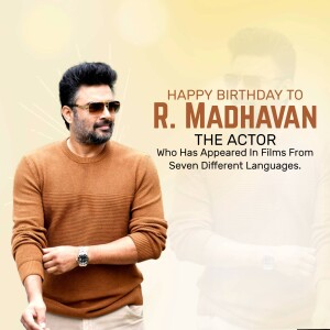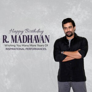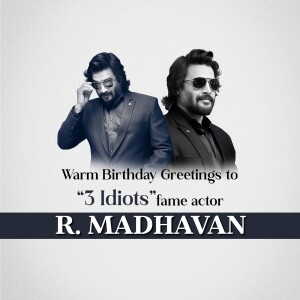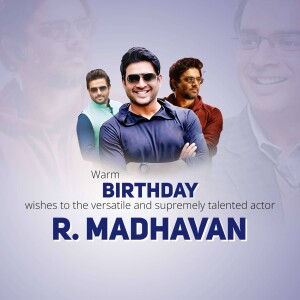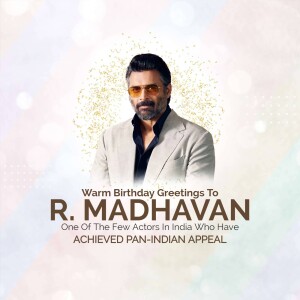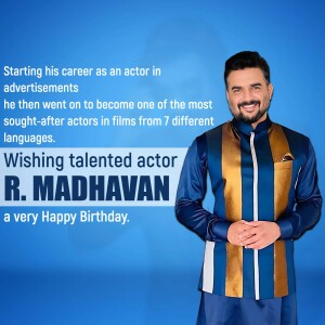 Description: An image celebrating R. Madhavan's birthday with a portrait of the actor and a birthday message in Marathi.