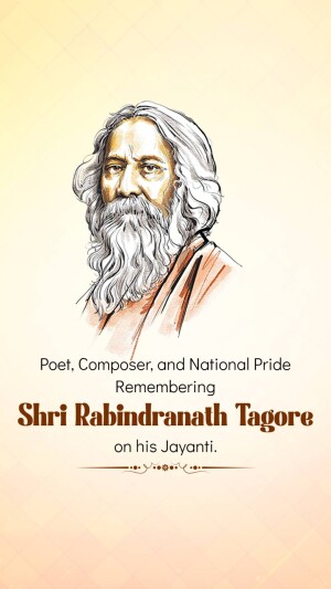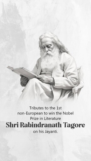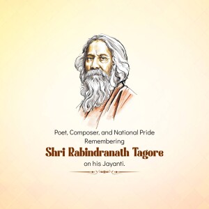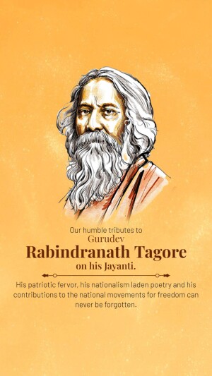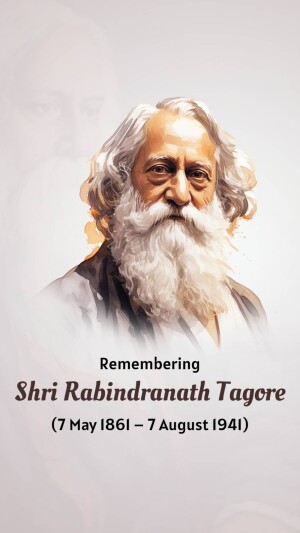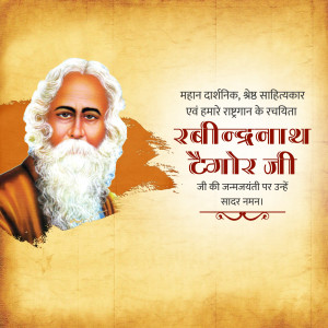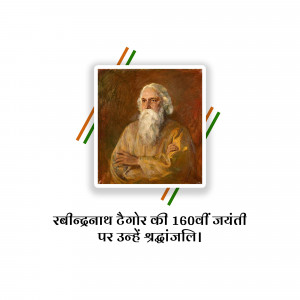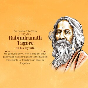 Description: An image featuring a black and white portrait of Rabindranath Tagore, a renowned Bengali polymath, with brush strokes of the Indian flag colors (saffron, white, and green) framing the image. Text in Gujarati is present at the bottom and top.