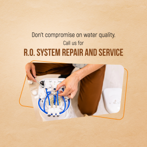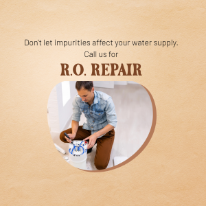 Description: An image depicting a man installing or repairing a water purifier in a home setting. The image is used for advertising RO and water purifier services.