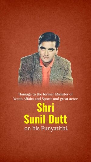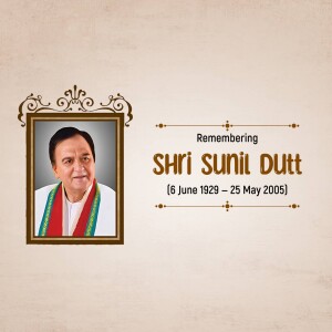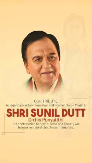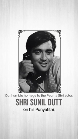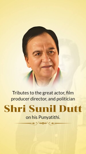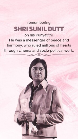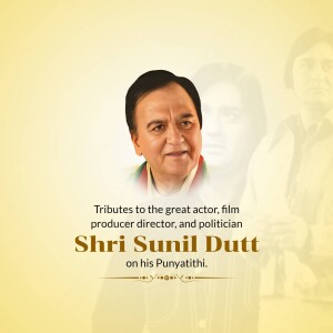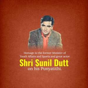 Description: A commemorative image featuring the late actor and social worker Sunil Dutt. The image includes a portrait of Dutt, a tribute message in Hindi, and floral decorations.