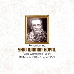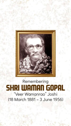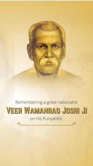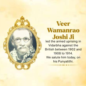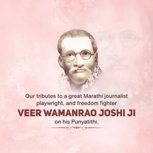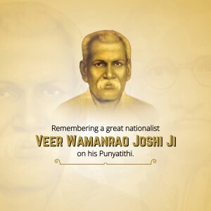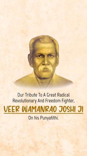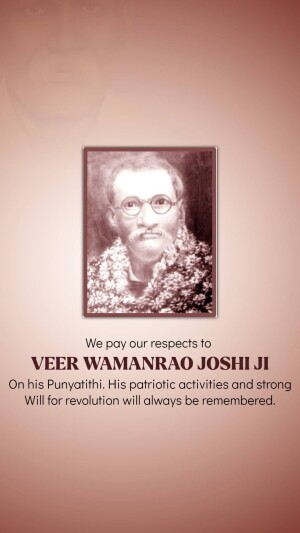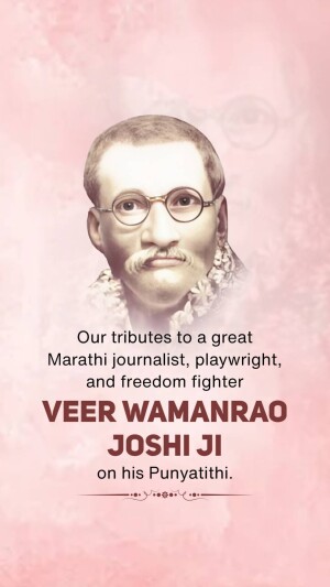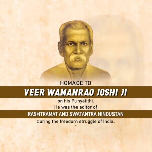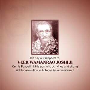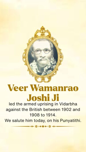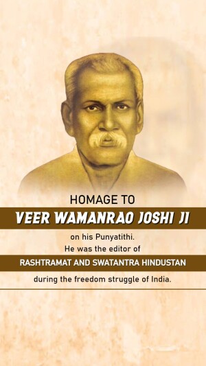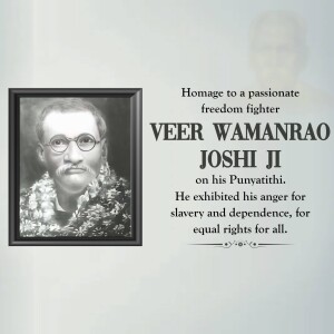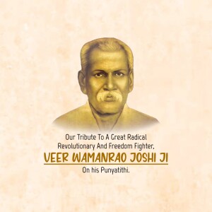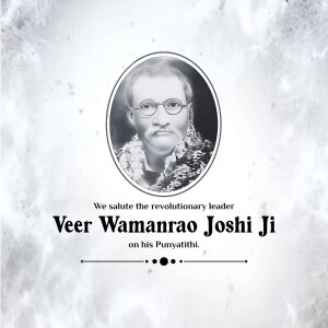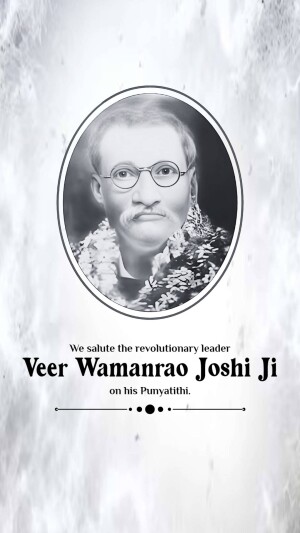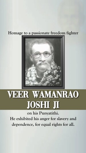 Description: A commemorative image featuring Veer Wamanrao Joshi Ji, a passionate freedom fighter, on his Punyathithi. The image includes a portrait of Joshi Ji adorned with a garland, along with text honoring his fight for equality and freedom.