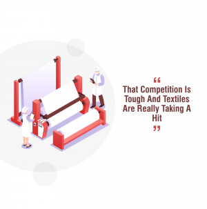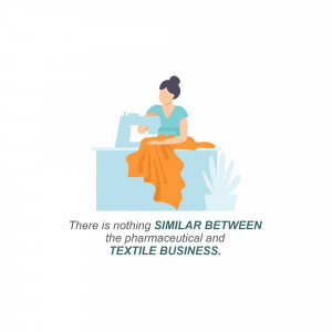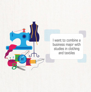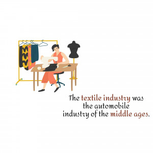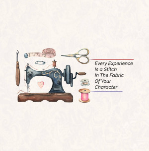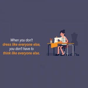 Description: A colorful cartoon illustration depicts a woman happily sewing with a sewing machine. She is seated at a desk, focused on her work with a piece of orange fabric.