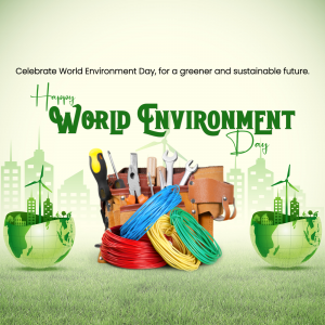 Description: A promotional graphic for World Environment Day featuring green leaves, a watering can sketch, a bright lightbulb, and text emphasizing environmental sustainability.